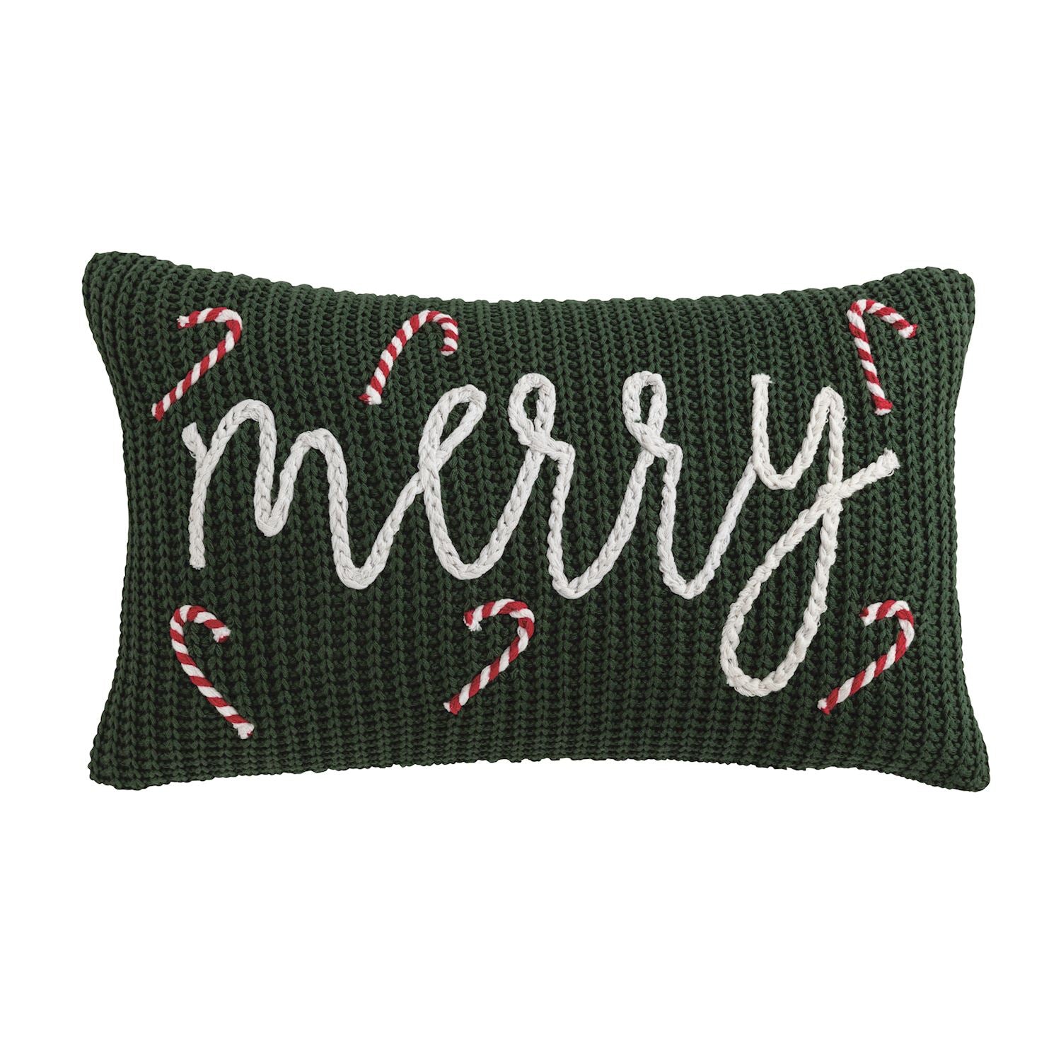 Knit long pillow features chunky knit embroidery and canvas backing. Zipper closure
