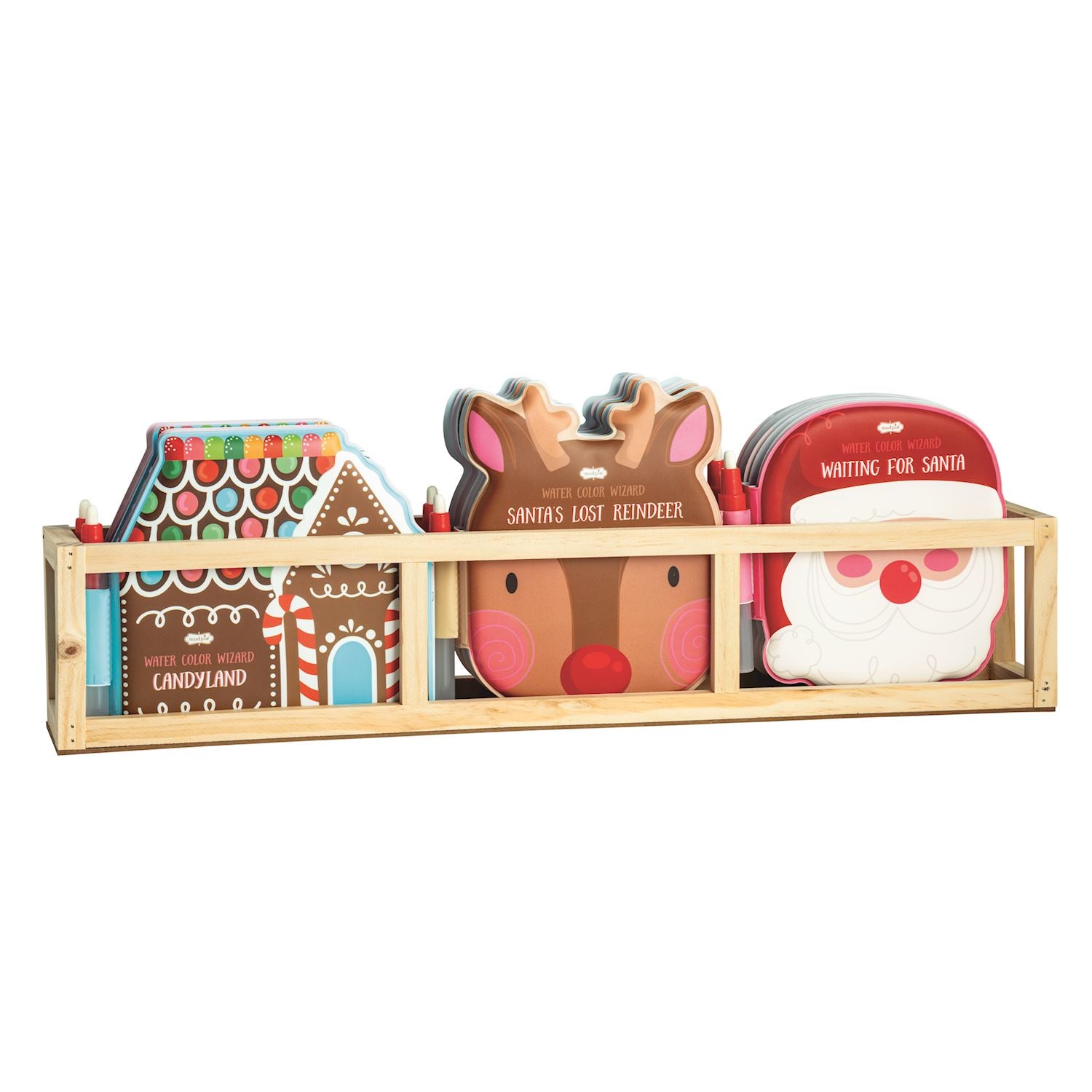 Water activated color changing book comes with water pen. Comes in wooden display crate. Ages 3+