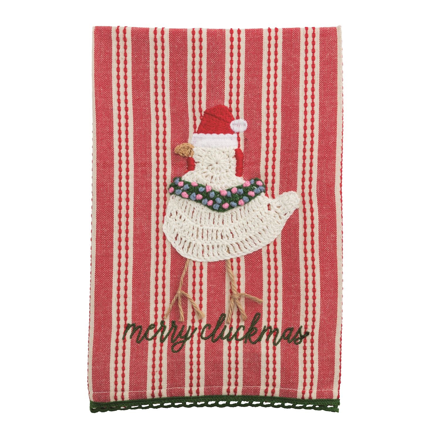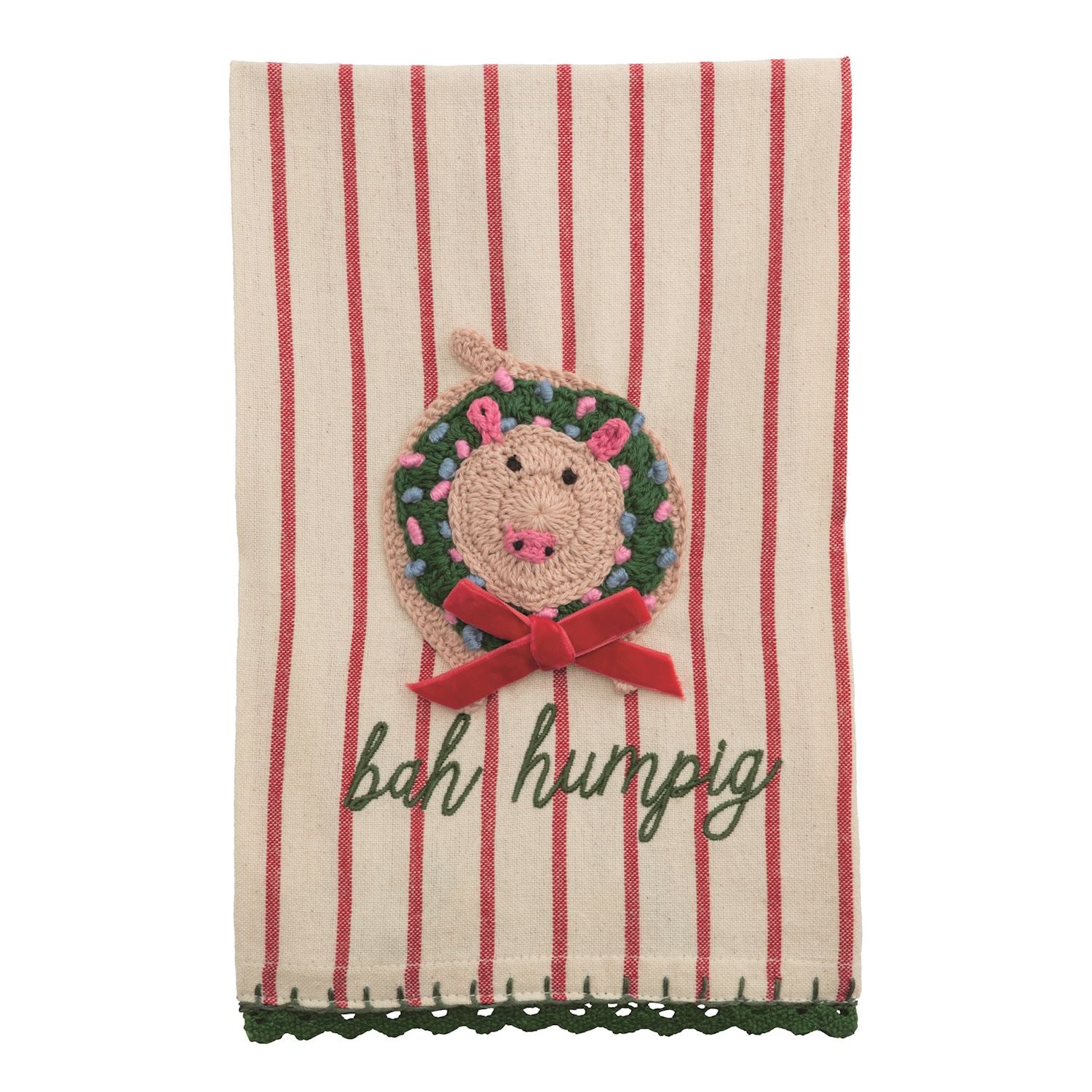 Embroidered cotton hand towel features crochet appliqué and hem trim