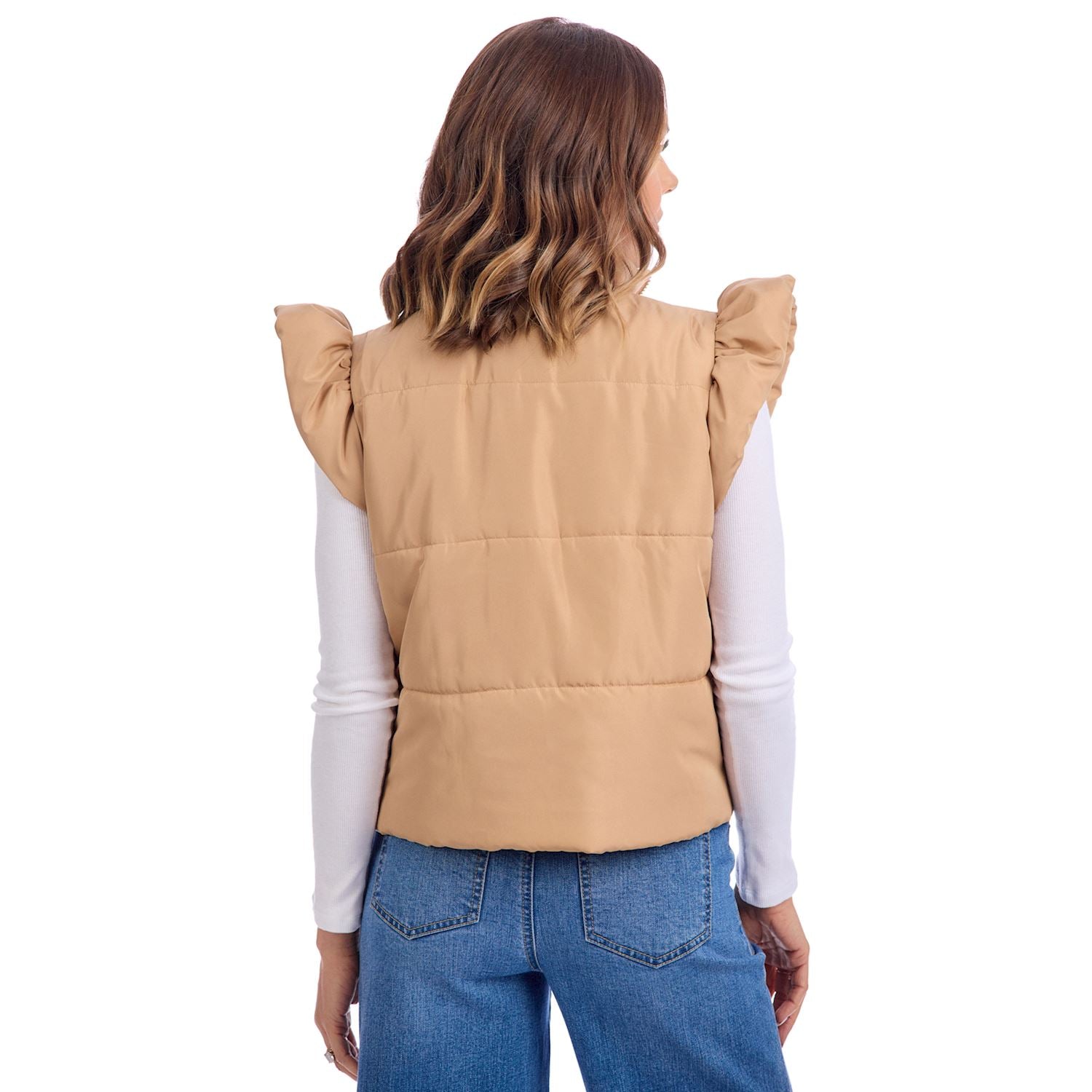Quilted nylon vest features ruffle sleeve detail, pockets and front zipper closure